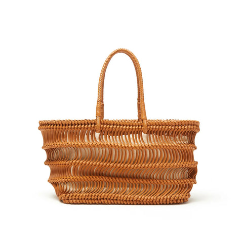 Sac cabas léger, parfait pour la journée comme pour la soirée, noué à la main à partir de fines lanières de cuir de veau par des artisans pendant 72 heures. Doublé d’une pochette en toile avec cordon, il peut contenir tous vos essentiels et se porter avec ou sans doublure.